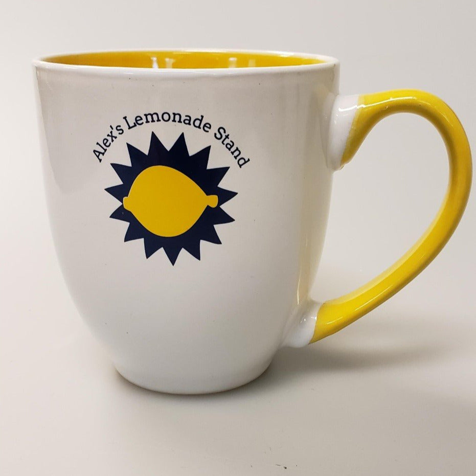 This 16oz bistro mug is perfect for coffee, tea, or even lemonade. It features a yellow handle and inside. On the outside, it features a lemon inside of a navy blue exclamation bubble. Enjoy a beverage of your choice, while showing your support for childhood cancer research.